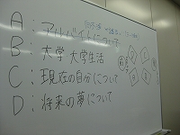 この企画では、テーマごとに分かれてもらって、そのテーマについて、初めての人ともフリートーク!テーマは4つ、大学・大学生活について、現在の自分について、将来の夢について、アルバイトについてがありました!